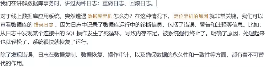 千万不要小看日志。很多看似奇怪的问题,答案往往就藏在日志里。很多情况下,只有通过查看日志才 能发现问题的原因,真正解决问题。所以,一定要学会查看日志,养成检查日志的习惯,对提升你的数 据库应用开发能力至关重要。