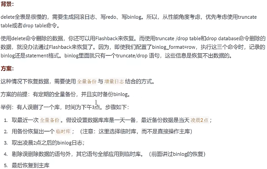 对于一个有高可用机制的MySQL集群来说,不用担心 rm删除数据 了。只是删掉了其中某一个节点的数据的话,HA系统就会开始工作,选出一个新的主库,从而保证整个集群的正常工作。我们要做的就是在这个节点上把数据恢复回来,再接入整个集群。